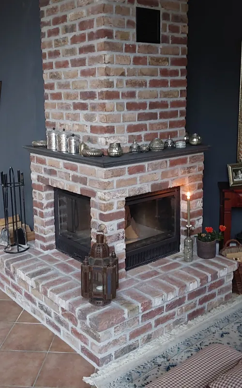 Backsteinriemchen Antik historisch - Einen Großteil unserer Riemchen gibt es auch als Klinkervollsteine und lassen sich so perfekt kombinieren. Bei diesem Kamin wurden Riemchen geklebt, Klinker gemauert und zum Schluss alles verfugt.