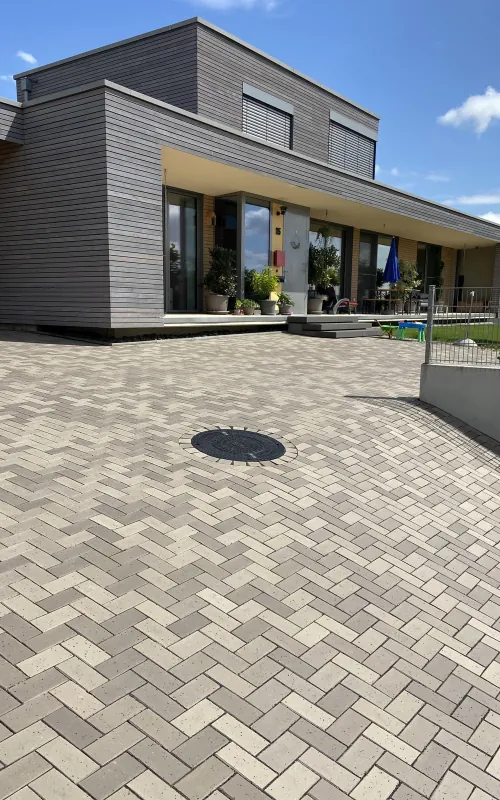 Pflasterklinker Eros getrommelt - Hier wurden die Pflasterklinker im Fischgrätmuster verlegt.