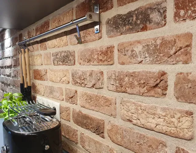 Winkelriemchen Antik classic rot und braun mit Kalk geschlämmt. Gleiche Eigenschaften wie das vorher beschriebene Backsteinriemchen Antik classic nur als Eckausführung. Die Ecksteine sind aus Vollsteinen geschnitten. Verarbeitet gleichen Sie einer gemauerten Klinkerwand ohne Unterschied und Einschränkung. Tolles Winkelriemchen für Innen und Außen geeignet. Dies ist eines unserer Klassiker und Topseller. Diese Sorte ist eine Mischung 50/50 aus roten und braunen Steinen. Durch die Beimischung des braunen Steins wirkt die Sorte etwas wärmer und ist beispielweise sehr gut mit dunklem Holz kombinierbar. Die Oberfläche der Steine ist sehr rau und grob und verleiht dem Stein seinen rustikalen Charakter. Die Schlämme ist bei dieser Sorte nicht zu stark und lässt noch sehr gut die Grundtöne erkennen. Besonders oft wird der Stein für eine alte Backsteinwand oder Ziegelwand im Wohnraum (z.B. im Wohnzimmer, Küche, Bad, Flur, Kamin) verwendet. Daneben findet die Sorte auch immer wieder den Einsatz an Hausfassaden oder Wärmedämmverbundsystemen. Inspiration 1 lfm = 13 Winkelriemchen mit 12-15 mm Fuge Maße: WDF ca. 192/80x14x65 mm (B/LxTxH) Winkelriemchen, die aus echten Steinen, Klinkern, Backsteinen oder Ziegeln geschnitten sind Dieses Sorte ist auch als Riemchen Antik Classic erhältlich. Alle anderen Riemchen findest du hier. Projekte - Die Winkelriemchen sind für Innen und Außen geeignet Schattenfuge - Es ist kein nachträgliches Verfugen nötig Vollfuge - Es kann nachträglich verfugt werden Sehr dünne Winkelriemchen - geringes Gewicht nur 6,5 kg/lfm In unserem Riemchen-Ratgeber findest Du ausführliche Informationen zur Herstellung von Klinker- und Backsteinriemchen und alle Aspekte und Hinweise zu einer optimalen Verarbeitung. Unsere Klinkerriemchen sind hochwertige Produkte. Sie werden aus neuwertigen und echten Klinkersteinen geschnitten. Jedes Winkelriemchen ist ein Unikat, das in unserer eigenen Produktion hergestellt wird. So erreichen wir ein unschlagbares Preis-/Leistungsverhältnis, wovon Du profitierst. Eine ausführliche Anleitung zu unserem Bestellablauf und Infos über Liefer- und Versandkosten sind hier einzusehen. Gerne erstellen wir Dir individuelle Angebote und unterstützen Dich bei jeglichen Fragen und dem perfekten Aufmaß. Kontaktiere uns dazu einfach über unser Kontaktformular oder nutze den Angebotsbutton im Warenkorb.