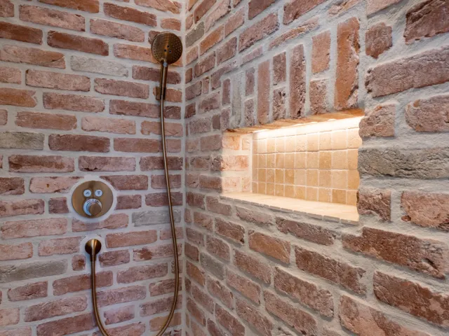 Gleiche Eigenschaften wie der vorher beschriebene Ziegelverblender Antik loft nur als Eckausführung. Die Ecksteine sind aus Vollsteinen geschnitten. Verarbeitet gleichen Sie einer gemauerten Klinkerwand ohne Unterschied und Einschränkung. Für Innen und Außen. Inspiration • 1 lfm = 13 Winkelriemchen mit 12-15 mm Fuge • Mindestabnahme von 30 lfm • Maße: WDF ca. 192/80x14x65 mm (B/LxTxH) • Winkelriemchen, die aus echten Steinen, Klinkern, Backsteinen oder Ziegeln geschnitten sind • Dieses Sorte ist auch als Riemchen erhältlich. Alle anderen Riemchen findest du hier. • Projekte - Die Winkelriemchen sind für Innen und Außen geeignet • Schattenfuge - Es ist kein nachträgliches Verfugen nötig • Vollfuge - Es kann nachträglich verfugt werden • Sehr dünne Winkelriemchen - geringes Gewicht nur 6,5 kg/lfm In unserem Riemchen-Ratgeber findest Du ausführliche Informationen zur Herstellung von Klinker- und Backsteinriemchen und alle Aspekte und Hinweise zu einer optimalen Verarbeitung. Unsere Klinkerriemchen sind hochwertige Produkte. Sie werden aus neuwertigen und echten Klinkersteinen geschnitten. Jedes Winkelriemchen ist ein Unikat, das in unserer eigenen Produktion hergestellt wird. So erreichen wir ein unschlagbares Preis-/Leistungsverhältnis, wovon Du profitierst. Eine ausführliche Anleitung zu unserem Bestellablauf und Infos über Liefer- und Versandkosten sind hier einzusehen. Gerne erstellen wir Dir individuelle Angebote und unterstützen Dich bei jeglichen Fragen und dem perfekten Aufmaß. Kontaktiere uns dazu einfach über unser Kontaktformular oder nutze den Angebotsbutton im Warenkorb.