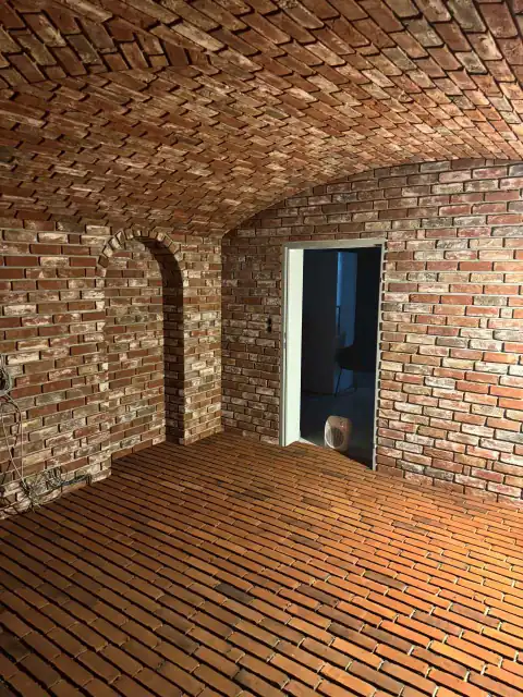 Ein Kellergewölbe aus Klinkerriemchen – An den Wänden die Sorte Antik rustik und auf dem Boden die Sorte New York Flamme. Ein echter Backstein-Traum.