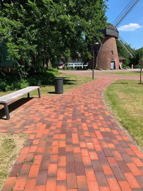 In diesem Bürgerpark mit alter Mühle wurden die Gehwege mit roten Pflasterklinker verlegt. Klassisch, zeitlos, stilvoll.