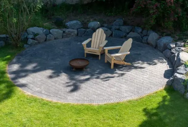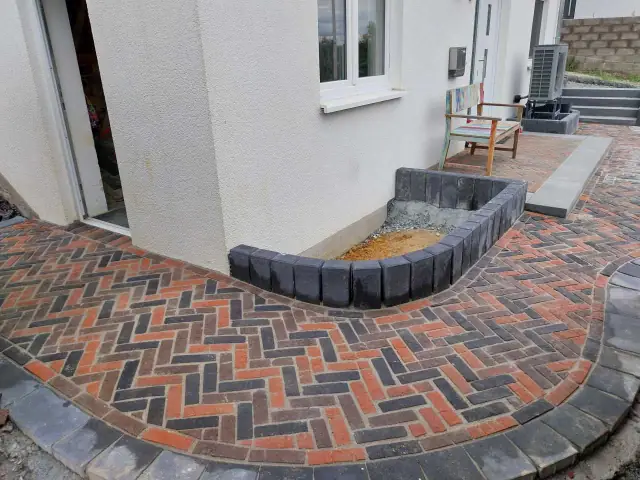 Eine ganz klassische rund angelegte Freisitz-Terrasse mit dem Pflasterklinker Eros getrommelt. Ein moderner, sauberer Hingucker im Garten.