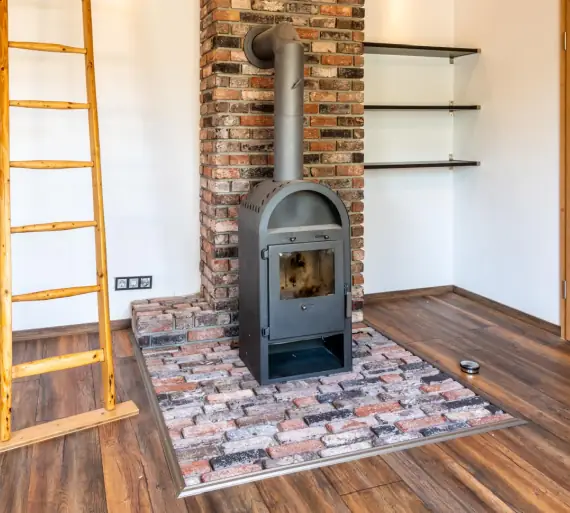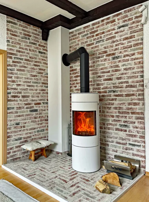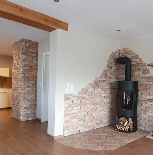 Einfach WOW – Ein geschlämmter Ziegelboden und eine Backsteinwand mit den Riemchen Retro industrial rot-weiß. Enstanden ist eine gemütliche Kaminofen-Ecke im Wohnraum.