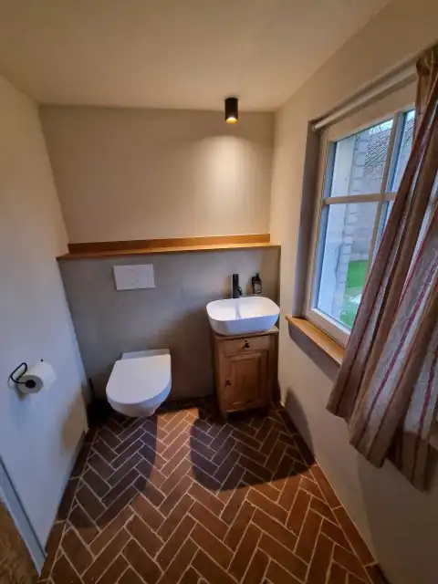 Die Klinkerriemchen New York Flamme verleihen dem Gäste-WC einen rustikalen Look. Der Boden aus Klinker ist ein echter Hingucker. Verlegt in Fischrät-Muster.